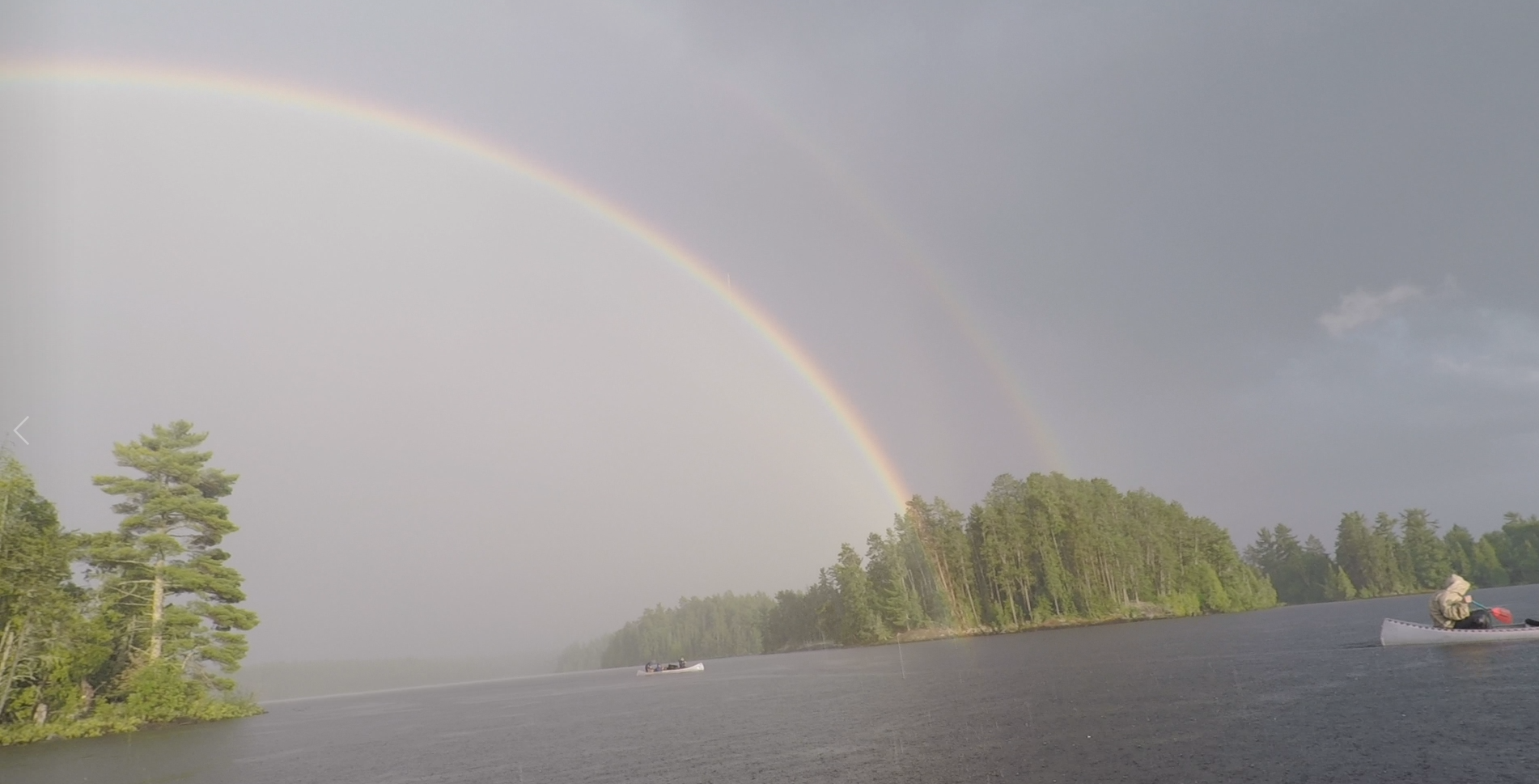 My own personal best memory happened during the pouring rain of one lake. I was on the lake, it was pouring rain, but I don’t recall feeling miserable. I imagine I had already been wet, as almost always, so I don’t think I would have felt the discomfort of rain. I was on the lake, it was pouring rain, and what I do remember, is someone calling out to look behind us. As if the rain was responding, it calmed down to a comfortable drizzle, as I turned around and I saw from the entire left to right of this lake, a massive double rainbow behind us. In the rain, I saw where all four ends of the rainbow ended, for it was here, on this lake. Perfectly centered around us, it felt like it arrived with our perspective in mind. If you looked very carefully the double rainbow may have been a triple, a faint one may have been between the two. People wonder where rainbows end, I hope it is always at a lake, because that moment was the greatest treasure. We turned back around to face forward, and the sun was now bright ahead of us resting in clear skies. Behind us was the rainbow, around us was the drizzle of the now fading rain, and ahead of us was clear skies. We knew where we needed to paddle toward. It was all so clear. Everything was so very… incredibly… clear. In the aftermath of the rain, I sat, stared, then let out an uncontrollable laugh. For a moment in time, I was happy, free, amazed, tired, and wet at the same time. That lake was worth its portage. How many more would I see?